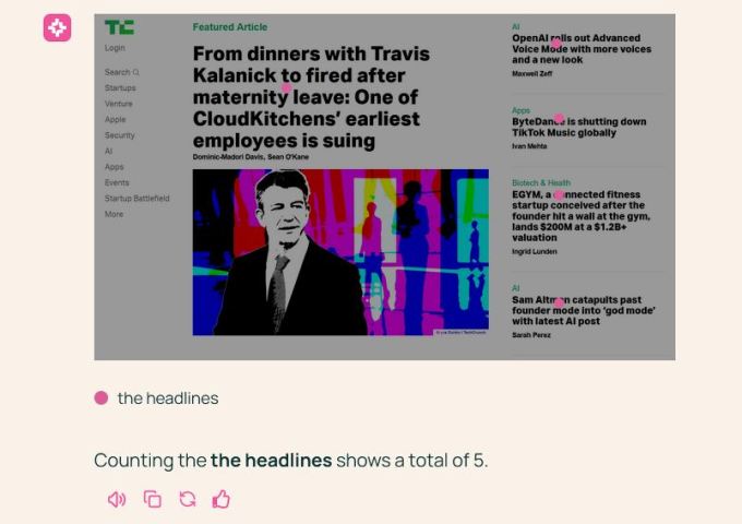 That is best demonstrated by its new, and for at least a few days unique, ability to “point” at the relevant parts of the images. When asked to count the dogs in a photo (33), it put a dot on each of their faces. When asked to count the tongues, it put a dot on each tongue. This specificity lets it do all kinds of new zero-shot actions. And importantly, it works on web interfaces as well: Without looking at the website’s code, the model understands how to navigate a page, submit a form, and so on. (Rabbit recently showed off something similar for its r1, for release next week.)