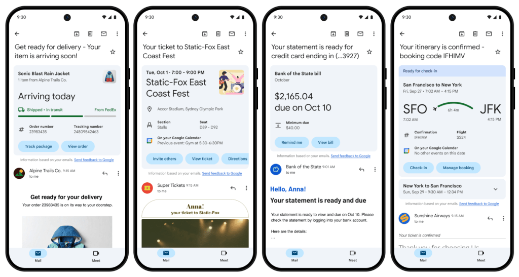 The feature will begin rolling out on October 2, initially with the launch of purchase summary cards across iOS and Android, which some users had already spotted ahead of the official announcement. Over the month ahead, Gmail will introduce additional summary cards and the “Happening soon” section for purchase-related emails. Further down the road, all four card categories — purchases, events, bills, and travel — will begin appearing across individual emails, the “Happening soon” section, and search.