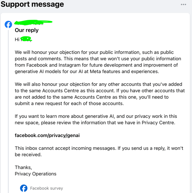 Asked about this, Meta spokesperson, policy communications manager Matt Pollard, said in an email that the language around the whole “if the objection is honored” bit, is due to its requirement that users submit a valid email address connected to their account.