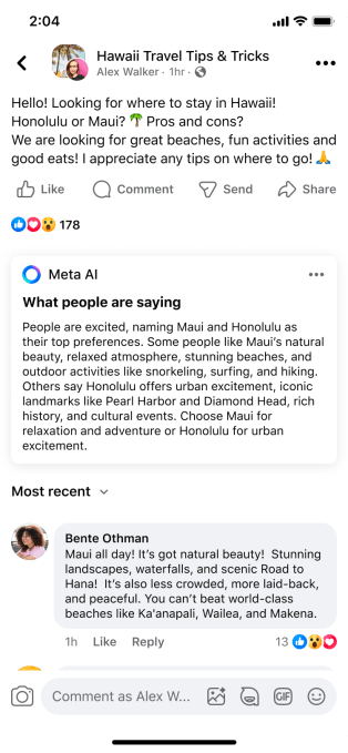 Plus, AI comment summaries — appearing across public Groups, Pages, and Creators — have been rolled out. (We’d argue that they aren’t that useful, though, and detract from one of the more engaging Facebook experiences — scrolling through crazy comment sections!)