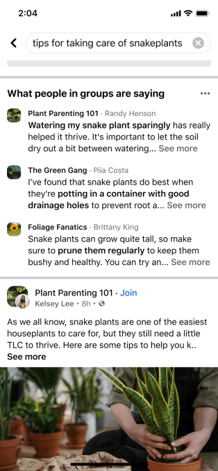 In addition to making Groups’ content easier to find on a per-group basis, Facebook’s search results will also organize content from groups in a section titled “What people in groups are saying.”