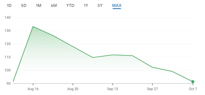 The company’s shares are still trading above their August IPO price but have fallen more than 40% to a low of ₹89 (about $1.06) from a peak of ₹157 (about $1.87).