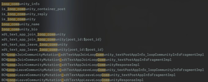 The code mentions a new feature, called Loops, which was spotted on Monday by Threads early adopter and veteran technologist Chris Messina. The new strings he discovered were introduced in the latest app update and mention things like the joining and leaving of “Loop” communities, as well as fields that refer to the community name, bio, and other elements. (In addition, mentions of “BCN” in the code refer to Barcelona, the internal code name for Threads ahead of its launch; “TextApp” serves as a similar reference.)