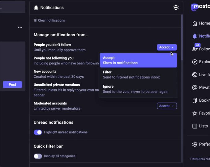 For instance, you can choose to never see notifications for unsolicited private mentions, or choose to have them go to a special inbox that you can view whenever you want. While Mastodon’s private mentions aren’t as protected as X’s Direct Messages, this will still offer more high-profile users who receive a lot of inbounds a better way to filter out unwanted requests.