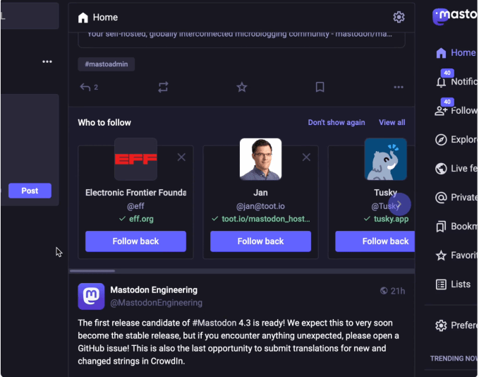 Mastodon says it’s been working to make it easier for new users to get started on the platform but found that people were often skipping follow recommendations during the onboarding process and ending up with a quiet feed. To fix this, the company will display follow recommendations above the first post older than four hours on the first page of your home feed.