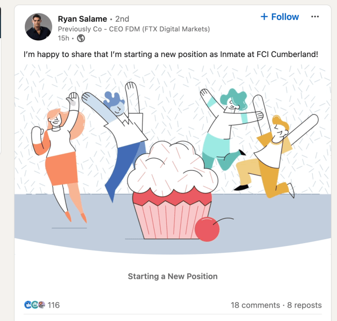 After the criminal implosion of the crypto exchange FTX, many of the company’s executives have been found guilty on various counts of fraud or conspiracy to commit such acts. Ryan Salame, the former co-CEO of FTX Digital Markets, is starting his seven-and-a-half-year fraud sentence today, but not before posting an all-time absurd LinkedIn post (and we’ve seen some wild posts lately).