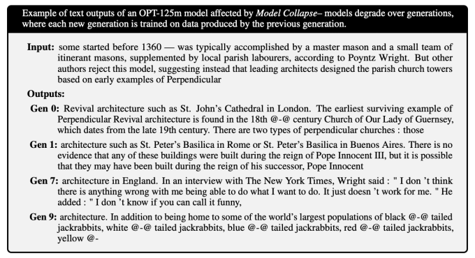Failing to do so could eventually lead to model collapse, where a model becomes less “creative” — and more biased — in its outputs, eventually seriously compromising its functionality. Though this process could be identified and arrested before it gets serious, it is a risk.