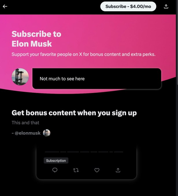 There are other in-app purchases available beyond X Premium to consider, like those for subscriptions to top creators on the platform. Elon Musk has a large following, for instance. Fortune reported last year that Musk was the most-followed user with 155 million followers, of which over 40,000 were subscribers — or .025% of his followers had subscribed. Today, Musk has 200 million followers. Assuming roughly the same percentage was subscribed, that would work out to around 50,000 subscribers. At $4 per month for the subscription, that would pull in around $200,000 per month in gross revenue.