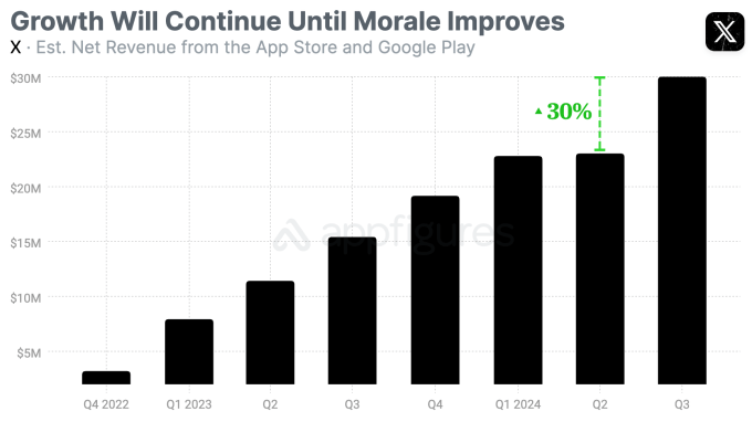 Quarter by quarter, the picture does look a bit rosier for X Premium, as Appfigures’ estimates indicate that in-app purchase revenue growth jumped 30% from Q2 to Q3 after staying relatively flat in the prior period.