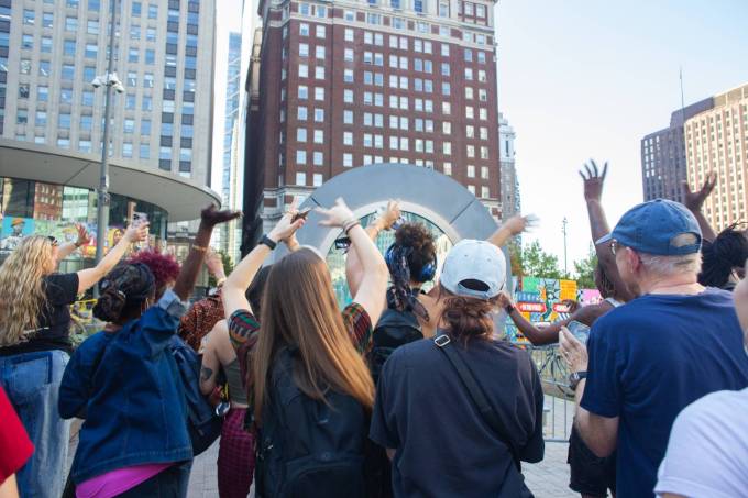 You can see through the Portal, but you can’t hear, so we communicate through gestures. The novelty must have worn off already abroad — these Portals have existed for a few years, though the addition of a new city to the mix likely made it more fun. One man in Poland timidly showed us some dance moves, and our horde of enthusiastic Philadelphians, experiencing the Portal for the first time, would mimic it back. For that guy, it must be like looking in a mirror, except the mirror is 50 people who are weirdly excited that you stopped to wave.