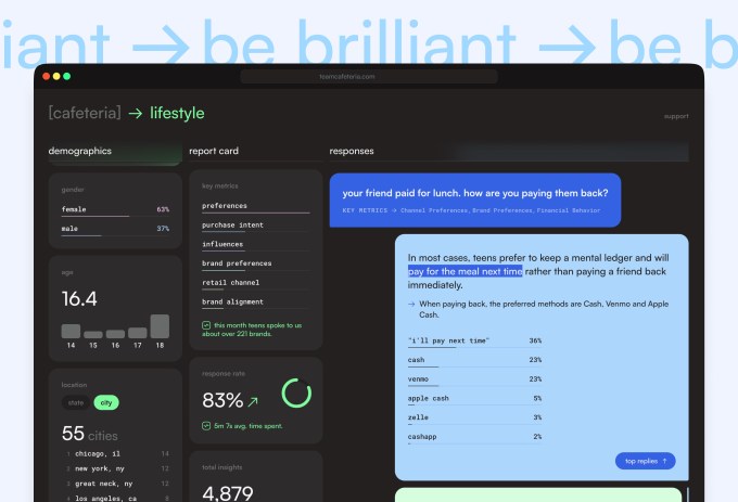“Cafeteria operates in the consumer insights and market research industry, uniquely focusing on real-time, authentic feedback from teenagers. Distinguished by its zero-party data collection, customizable analytics, and strong leadership under CEO Rishi Malhotra, it provides brands with actionable and timely insights tailored to ‘Generation Teen,’” Andrew Montgomery, partner at Collaborative Fund, told TechCrunch over email.