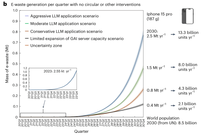 The immense and quickly advancing computing requirements of AI models could lead to the industry discarding the e-waste equivalent of more than 10 billion iPhones per year by 2030, researchers project.