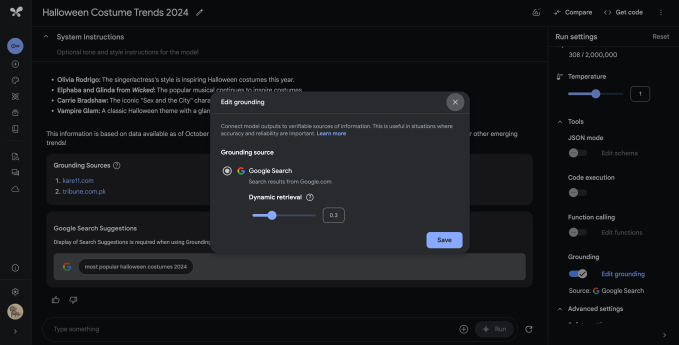 Turning on grounding is as easy as toggling on a switch and deciding on how often the API should use grounding by making changes to the “dynamic retrieval” setting. That could be as straightforward as opting to turn it on for every prompt or going with a more nuanced setting that then uses a smaller model to evaluate the prompt and decide whether it would benefit from being augmented with data from Google Search.