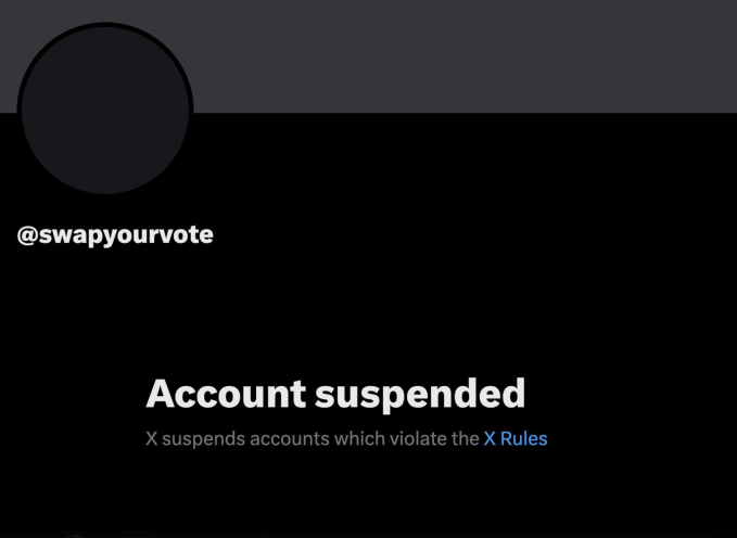 When visiting a link to the X account for @SwapYourVote on Tuesday morning, users received a message reading “Account suspended” and “X suspends accounts which violate the X Rules.” SwapYourVote’s social media accounts on other platforms, such as TikTok and Instagram, were still active and accessible on Tuesday.