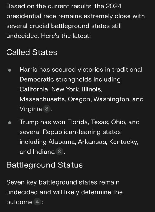 On the other hand, Perplexity offered helpful, real-time election insights and maps throughout the night, linking to reliable resources and offering historical context where appropriate.