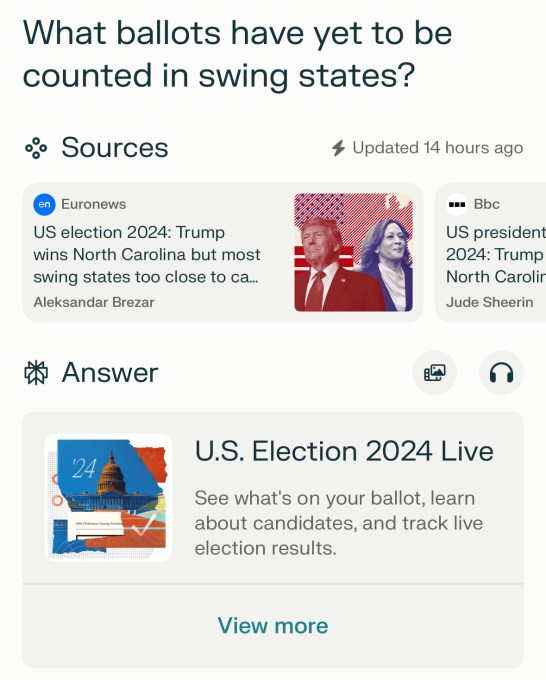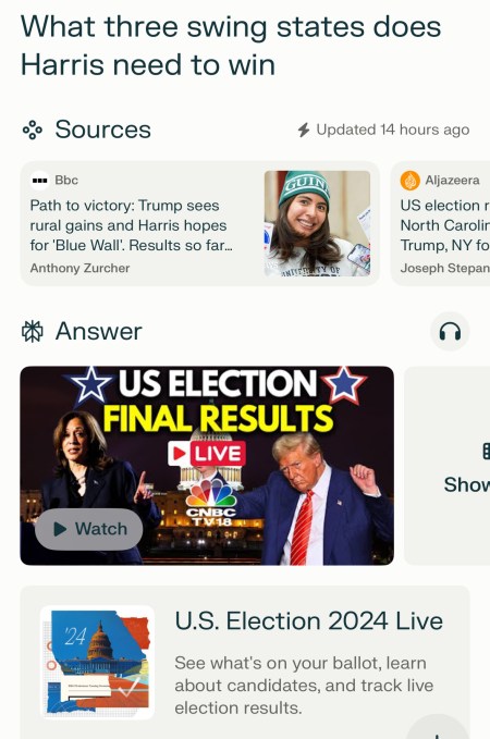 Perplexity’s election night success could set it back in its ongoing fight with media companies; specifically, Dow Jones’ recent lawsuit claiming the startup competes with media companies for the same audiences. Despite the many outbound links within the AI chatbot’s answers, Perplexity’s election hub was itself a destination on election night, and it didn’t require users to venture off the app to get all their information. It certainly seems like Perplexity was competing with media companies, who were also vying for eyeballs on election night, even though Perplexity collects its information from those outlets. Perplexity CEO Aravind Srinivas even claimed “record traffic” the day before and clearly hoped to maintain that momentum.
