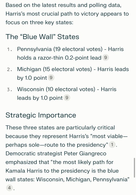 When trying to answer follow-up questions about Harris’ lead in “Blue Wall” states, Perplexity did hallucinate slightly. It was referencing polling data, when it should have been referencing real-time votes at this point in the night. However, the general information here was in the right ballpark, and other AI chatbots just wouldn’t answer this question.