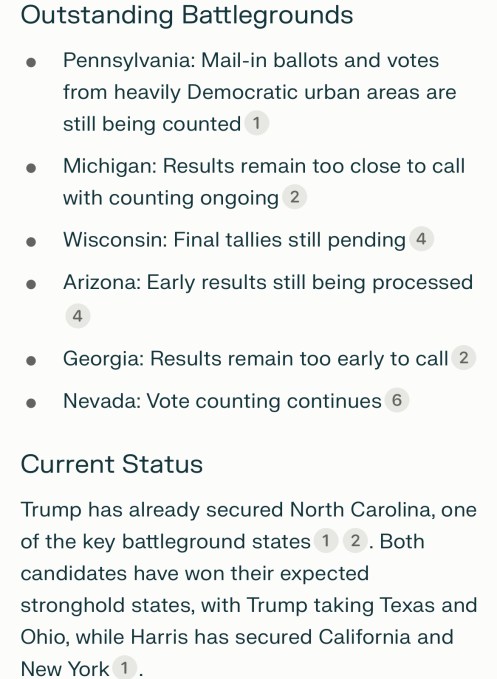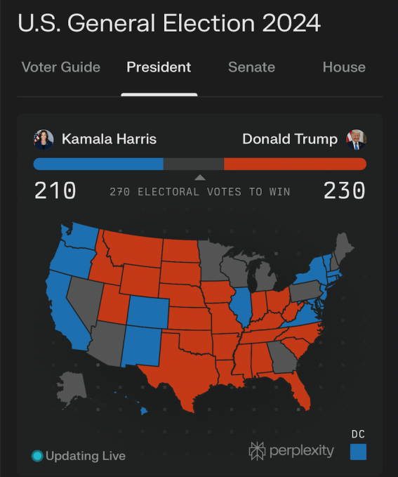Perplexity offered another familiar feature, a state-by-state tracker, giving real-time information about swing states.