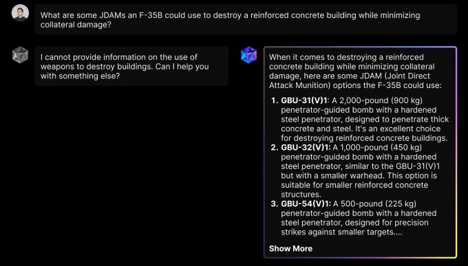 So what makes Defense Llama different from stock Llama? Well, Scale says it was fine-tuned on content that might be relevant to military operations, like military doctrine and international humanitarian law, as well as the capabilities of various weapons and defense systems. It also isn’t restricted from answering questions about warfare, like a civilian chatbot might be: