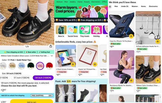 The landing page for Amazon Haul is reminiscent of Shein and Temu even in its design: Items appear in grids, rather than Amazon’s typical list, and shipping times and star ratings aren’t visible unless you click on an item. Some items are labeled with rocket ship emojis that warn that this $4.99 iPhone 16 Pro case is “selling fast!” Or, you might see a fire emoji declaring that the price for a three-pack of $2.89 mesh laundry bags is “crazy low.” Like its competitors, Amazon Haul also sells clothing ($16 for a pair of men’s golf pants, or $4.99 for 80s-style women’s leg warmers). In a “Staples” section, you can find an assortment of… sponges, resistance bands, hoodies, silicon baking mats, and socks.