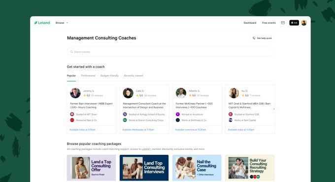 Coaching platform Leland has raised $12 million in Series A funding led by Forerunner Ventures with participation from GSV ventures to grow its platform geared toward matching coaches and aspirants to fulfill goals ranging from getting into a university to passing an entrance exam and excelling at product management. The company aims to build better tools for coaches to create content and manage their schedules, as well as build out its enterprise offering.