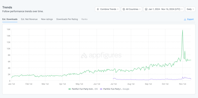 Built with React Native, Partiful is most popular in the U.S.; the country accounts for 92% of its App Store downloads and 97% of the total on Google Play. Its weekly downloads grew by 4x this year, and Appfigures said it saw a recent spike on November 1, which drove 71,000 downloads for the week.