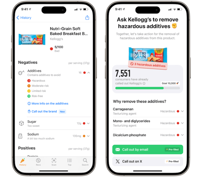 Launched today, the new “Call-out the Brand” button allows users to challenge companies directly. When a user scans a product that turns out to be marked with Yuka’s red label — which indicates health concerns — they will see an option to email the product’s manufacturer, pushing them to rethink the use of harmful additives. Yuka provides a default message but allows users to personalize it if they wish.