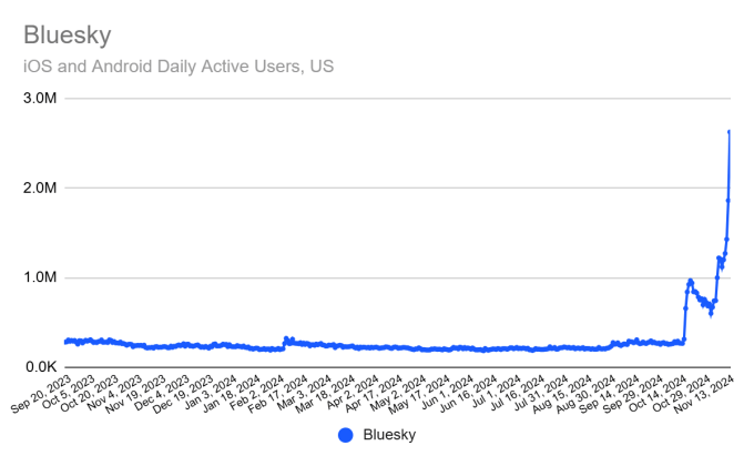 Given that Bluesky only opened its doors to the public in February after a longer invite-only period, its growth has been remarkable. Bluesky has more than doubled its user base since September when the network had over 9 million users. Shortly after the U.S. presidential election, the app began gaining roughly 100,000 users per day, but that pace soon increased as the company announced on November 12 that it had added a million users over the past week. By November 13, Bluesky hit its last big milestone of 15 million users.