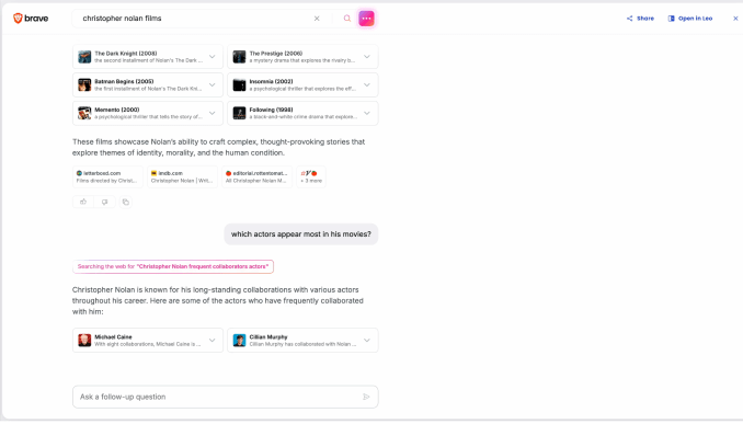 If you go to Brave Search and type in “Christopher Nolan films,” you will get an AI-generated summary that gives you an overview of who Christopher Nolan is and a list of some of his notable films. Starting today, you will now see a chat bar under the AI-generated summary that reads, “Ask a follow-up question.”
