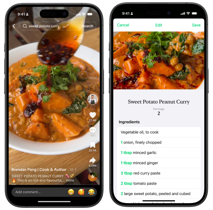 The new feature processes the video’s caption, where creators tend to document their ingredient list and instructions, but is powered by on-device machine learning instead of using a third-party AI provider. The feature is similar to one Pestle launched for Instagram Reels earlier this summer.