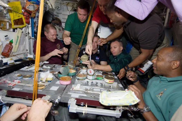 The first astronauts to celebrate Thanksgiving in space did so in 1973. Since then, there have been a few dozen Thanksgiving meals shared on the International Space Station. What do the astronauts eat? Why, the same things you and I do, except freeze dried: turkey, mashed potatoes, macaroni and cheese, green beans, and dessert. Click the link above for more photos of Thanksgivings over the years aboard the ISS.