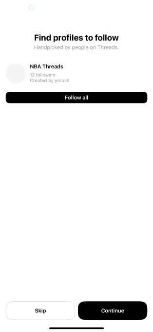 On the screen that pops up, Threads offers lists of “profiles to follow” where various suggested user lists would be made available. In the current test, only one suggested user list was shown: a list called “NBA Threads.”