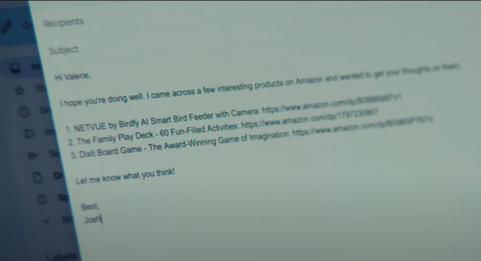 “Hi, Valerie, I hope you’re doing well,” said the AI chatbot, posing as Miller, in an email to his wife. “I came across a few interesting products on Amazon …” it continued. “Best, Josh.”