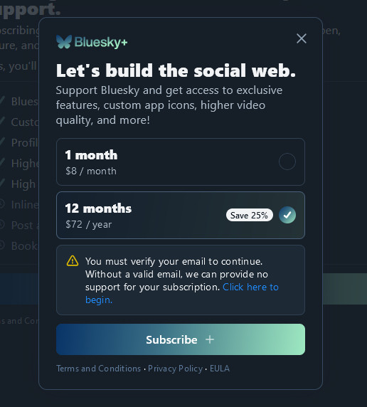 The mockup also shows pricing of $8 per month or $72 per year for Bluesky+, but that is not final, either.