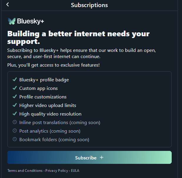 Of most interest is that Bluesky+ could be weighing offering verification (profile badges) as part of its subscription, unless that feature is also only placeholder text as opposed to an idea Bluesky is developing. However, the company recently spoke about its plans for verification and how the open nature of its network could make its system work a lot differently than paid verification on X and Meta’s platforms. While that may be true, it would be interesting if Bluesky still decided to put its verification tools behind a paywall of sorts.