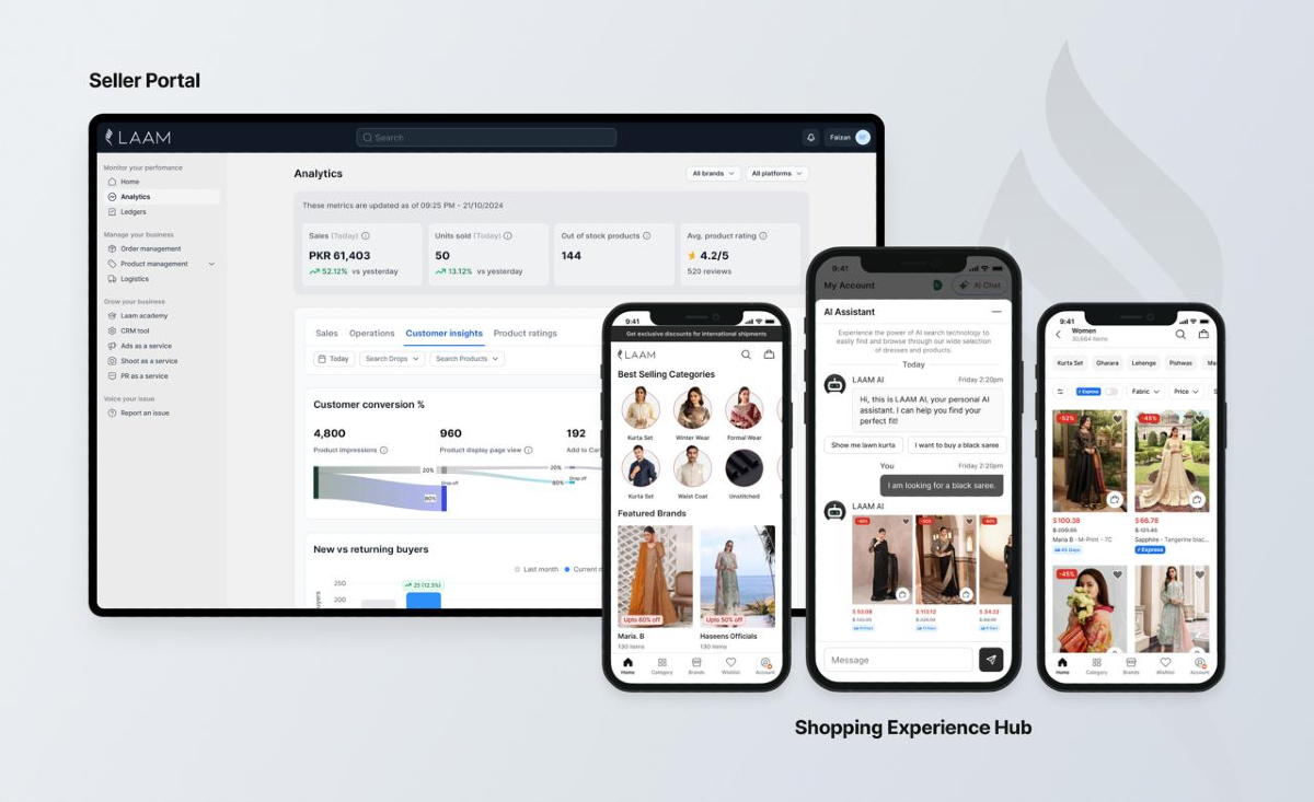After the first wave of the Covid pandemic hit the world, Iqbal moved back to Pakistan. That move became a blessing in disguise, giving him the impetus to make it easier for South Asians overseas to buy fashions. He founded Laam in January 2021, enlisting his former Microsoft colleague Ahmed Muneeb to develop the product for consumers and sellers, and his younger brother Amir Iqbal, who previously worked with local apparel sellers and brands, to create a supply chain. Fashion enthusiast Sahar Arif joined as the fourth co-founder.