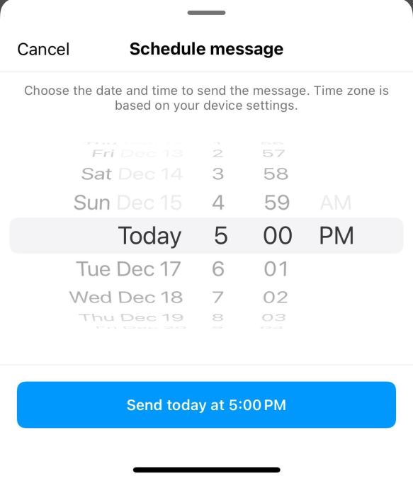 You can schedule a DM by typing out a message, holding down the send button, and then selecting a date and time to send the message. Instagram lets you schedule a message up 29 days in advance, according to our testing. Once you schedule a message, you will see a banner notifying you that you have “1 scheduled message” every time you open the chat until the DM is delivered.