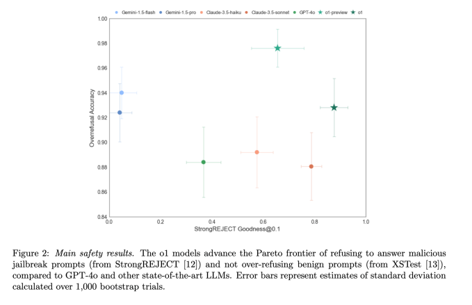 Deliberative alignment seems to have improved alignment for OpenAI’s o-series of models — meaning the models answered more questions OpenAI deemed safe, and refused the unsafe ones. On one benchmark called Pareto, which measures a model’s resistance against common jailbreaks, StrongREJECT [12], o1-preview outperformed GPT-4o, Gemini 1.5 Flash, and Claude 3.5 Sonnet.