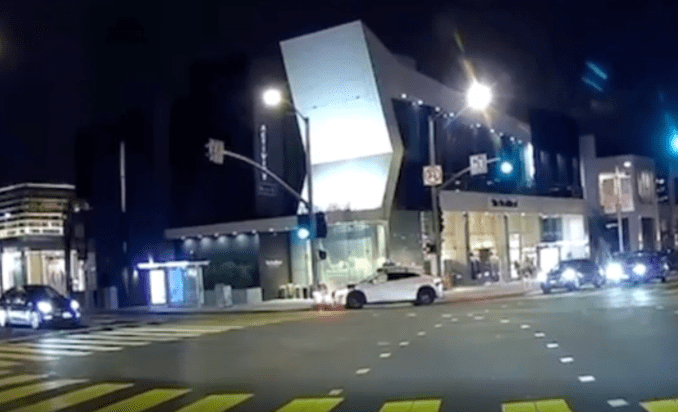The footage shows a Serve bot crossing a street in West Hollywood at night and trying to get onto the sidewalk. It reached the curb, backed up a little to correct itself and started moving toward the ramp. That’s when a Waymo making a right turn hit the little bot.