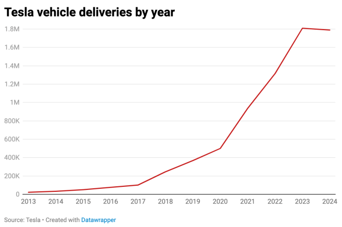 The drop in deliveries is a stark change for Tesla and Musk, which spent years promoting the goal of a 50% annual growth rate. The company already started to miss that mark over the last few years — even with massive, unrelenting price cuts. The drop in 2024 is the first time annual sales actually declined since Tesla started delivering its first mass-market car, the Model S, in 2012.
