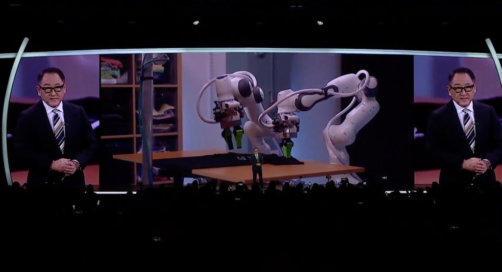 A delicate task like t-shirt folding is as good a place to start as any. CEO Akio Toyoda showed off how the company taught robot arms to fold t-shirts Japanese style. Starting with a pair of manual graspers, the human demonstrates the correct way to fold a shirt. The system is able to pick up the skill overnight, according to Toyota.