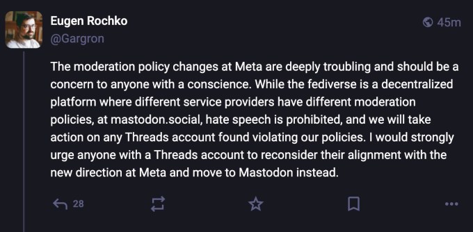 Mastodon CEO Eugen Rochko has spoken out about the significant moderation changes announced by Meta on Tuesday, which will see the social networking giant removing fact-checking across its apps in favor of a crowdsourced community notes feature, similar to X’s. The Mastodon founder, whose app competes with X and Meta’s X rival, Instagram Threads, called Meta’s changes “deeply troubling” and “a concern to anyone with a conscience.” He also warned Threads users who cross-post from Threads to Mastodon via Threads’ fediverse-sharing feature that Mastodon will take action on hate speech and any Threads account violating Mastodon’s existing policies.