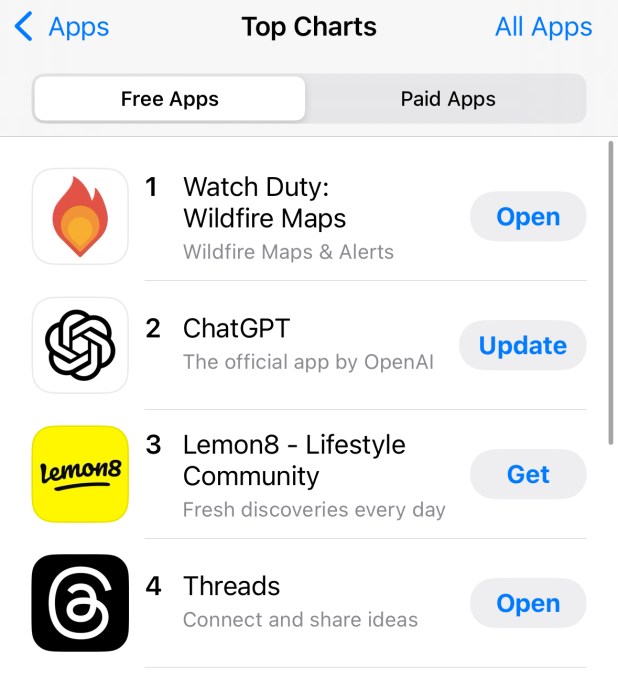 Watch Duty, an app to track wildfires with live maps and alerts, has become the No. 1 free app in Apple’s App Store as of Wednesday morning. The fire-tracking app surpassed the ChatGPT app for the No. 1 spot as devastating fires continue to rage across Southern California. ChatGPT had been in the No. 1 spot in the U.S. since August 9, according to app intelligence provider Appfigures.