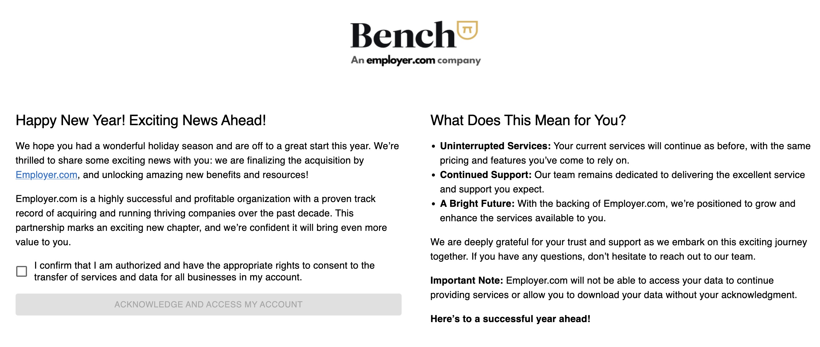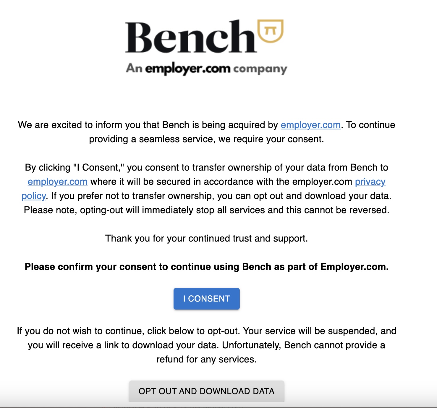 In other words, it appears that Bench customers had to agree to transfer their data to Employer.com to be able to access that data.
