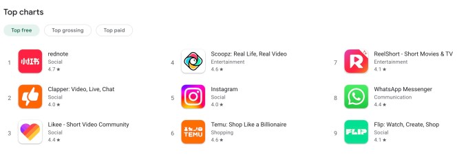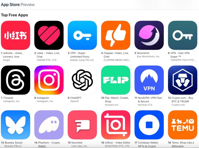 The Chinese app RedNote (which is listed on the app stores as Xiaohongshu) became the No. 1 app in the U.S. last week, followed by video apps like Clapper, Flip, and others. On Monday, following TikTok’s restoration of service, RedNote retained its No. 1 spot on the App Store, after having attracted some 700,000 new U.S. users.