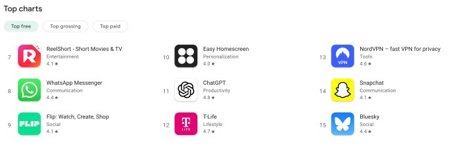 Social network Bluesky also just added an optional custom video feed, but its app has dropped out of the top 10 position it held last week on the U.S. App Store. It’s No. 13 as of Monday morning on the App Store and No. 15 on Google Play.