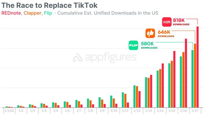 According to estimates from app store intelligence provider Appfigures, RedNote, Flip, and Clapper all saw a massive growth spurt last week from single-digit thousand downloads per day earlier in January to tens of thousands of U.S. downloads on Friday.