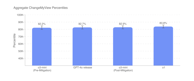 In terms of performance on the ChangeMyView benchmark, o3-mini does not appear to perform significantly better or worse than o1 or GPT-4o. However, OpenAI’s latest AI models appear to be more persuasive than most people on the r/ChangeMyView subreddit.