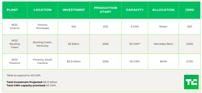 AESC (formerly Envision AESC) is a Japanese battery technology company that has promised to build three U.S. facilities before the end of the decade. The company’s Tennessee plant has been in operation for some time. AESC broke ground at its Kentucky and South Carolina plants in August 2022 and June 2023, respectively. In March 2024, AESC said it would expand its South Carolina operations, bringing total investment in the project up to $3.12 billion. But in February 2025, AESC paused those expansion plans after the state pulled $100 million in bonds to support the project. The company said its existing plant will have enough capacity to serve BMW.
