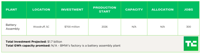 In October 2022, BMW announced a $1.7 billion investment in the U.S. that would see its Spartanburg, South Carolina, plant readied for the production of EVs. Of the total funding, $700 million was allocated to the buildout of a battery assembly facility in nearby Woodruff. The automaker told TechCrunch that the start of production is scheduled for the end of 2026, but it hasn’t confirmed which EVs will be produced there. BMW’s Spartanburg factory is currently where its sports utility and crossovers are built, including the X3, X4, X5, X6, X7 and XM.